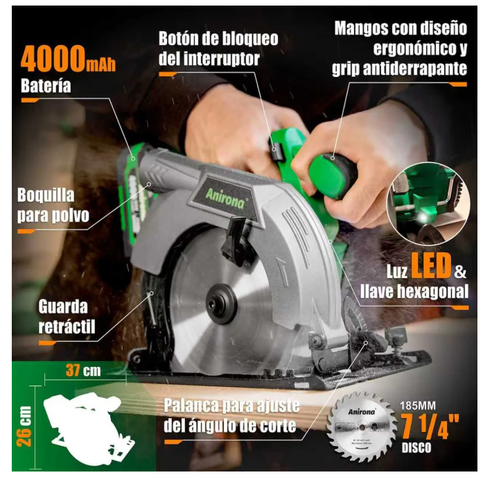 Sierra Circular Sin Carbones Inalámbrico 7-1/4 Anirona 1 Batería 4.0ah A40CS185
