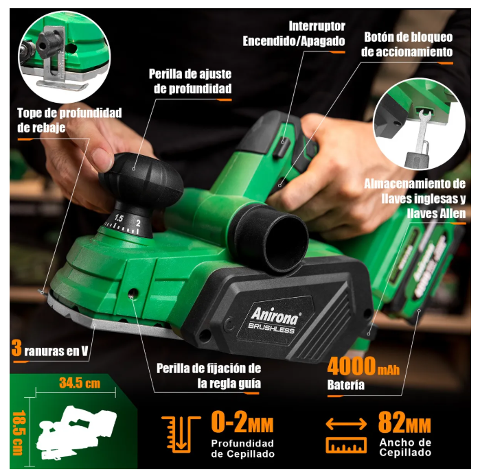 Cepillo Para Madera Inalámbrico Sin Escobillas 1 batería 4.0ah Anirona AA20-PM8201