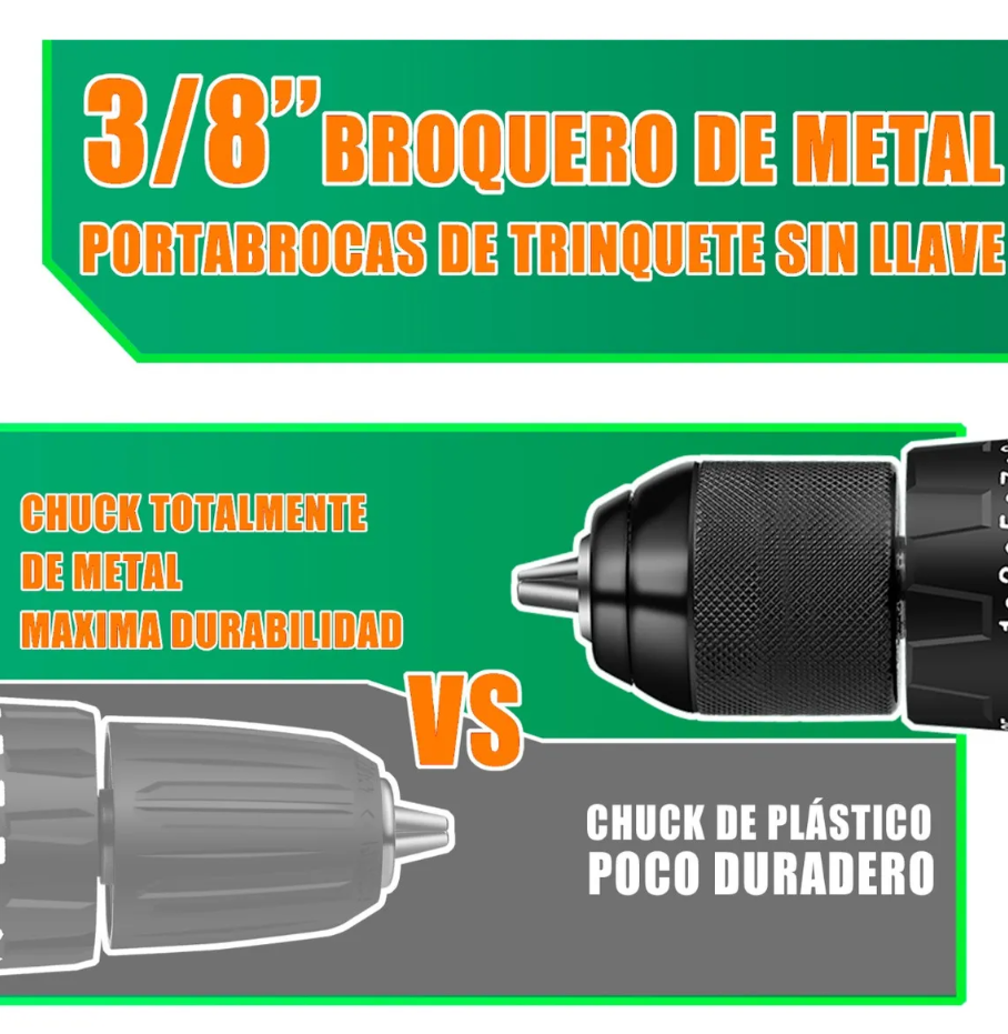 * Porque nuestro Taladro es duradero y se puede utilizar durante muchos años, cuenta con un motor que no trae escobillas, haciendo que tenga un 60% más de vida útil, a comparación de un taladro con escobillas.