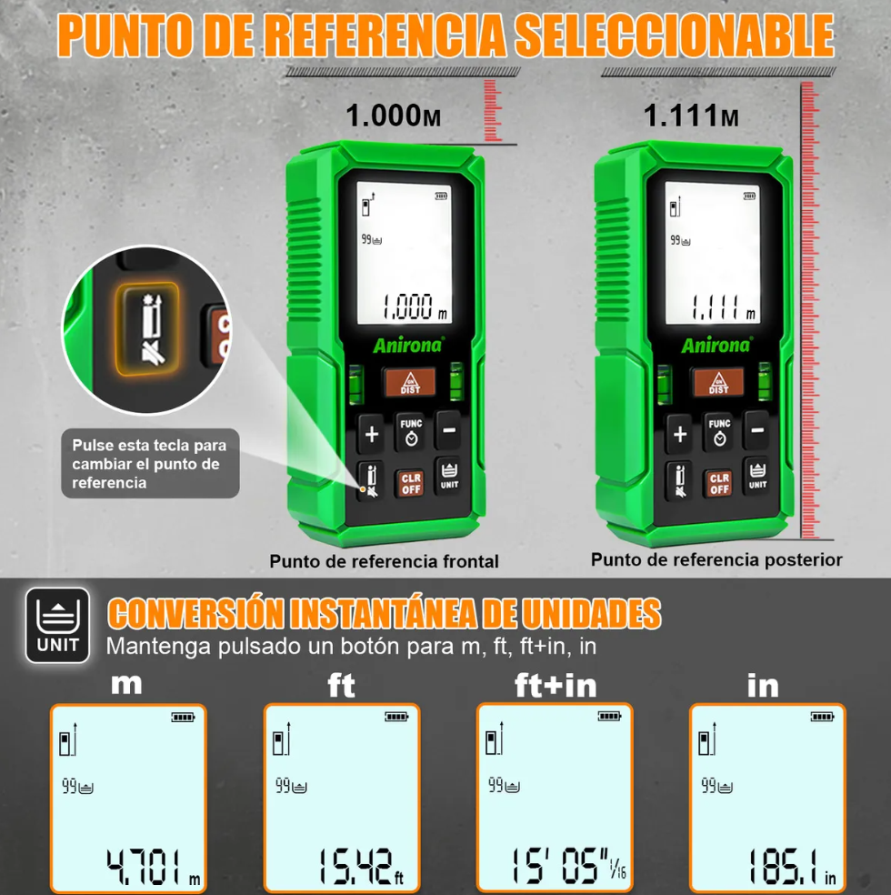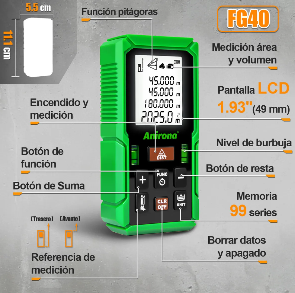 Anirona lanza su nuevo asistente de medición el medidor láser FG40 con pantalla LCD de alta definición, capaz de medir hasta 45 metros. Especificaciones técnicas: Precisión:2 mm Unidades de medida: m/in/ft/ft+in Clase de láser: Clase 2 Rango de medición: 0.05 metros a 45 metros Unidad de almacenamiento: 99 grupos de memoria de datos Nivel de ángulo: nuevo sensor de ángulo electrónico Pantalla: luz de fondo de una nueva pantalla LCD grande Baterías: 2 pilas AAA Multifunción de medición: Este telémetro láser no solo mide distancias, sino que también ofrece modos de medición de área, volumen y teorema de Pitágoras. Además, permite mediciones continuas, operaciones de suma y resta, comparación de distancias y almacenamiento de hasta 99 datos. ¡Un solo dispositivo para satisfacer todas sus necesidades de medición! Medición precisa: Este medidor de distancia tiene una distancia mínima de medición de 0.05 m y un margen de error de aproximadamente 2 mm, lo que lo convierte en una herramienta confiable para lograr mediciones precisas. Gran capacidad de almacenamiento: El medidor de distancia puede guardar 99 conjuntos de datos, permitiéndole registrar mientras mide sin preocuparse por perder los resultados. Puede consultar en cualquier momento el historial de mediciones. Cuatro unidades disponibles: