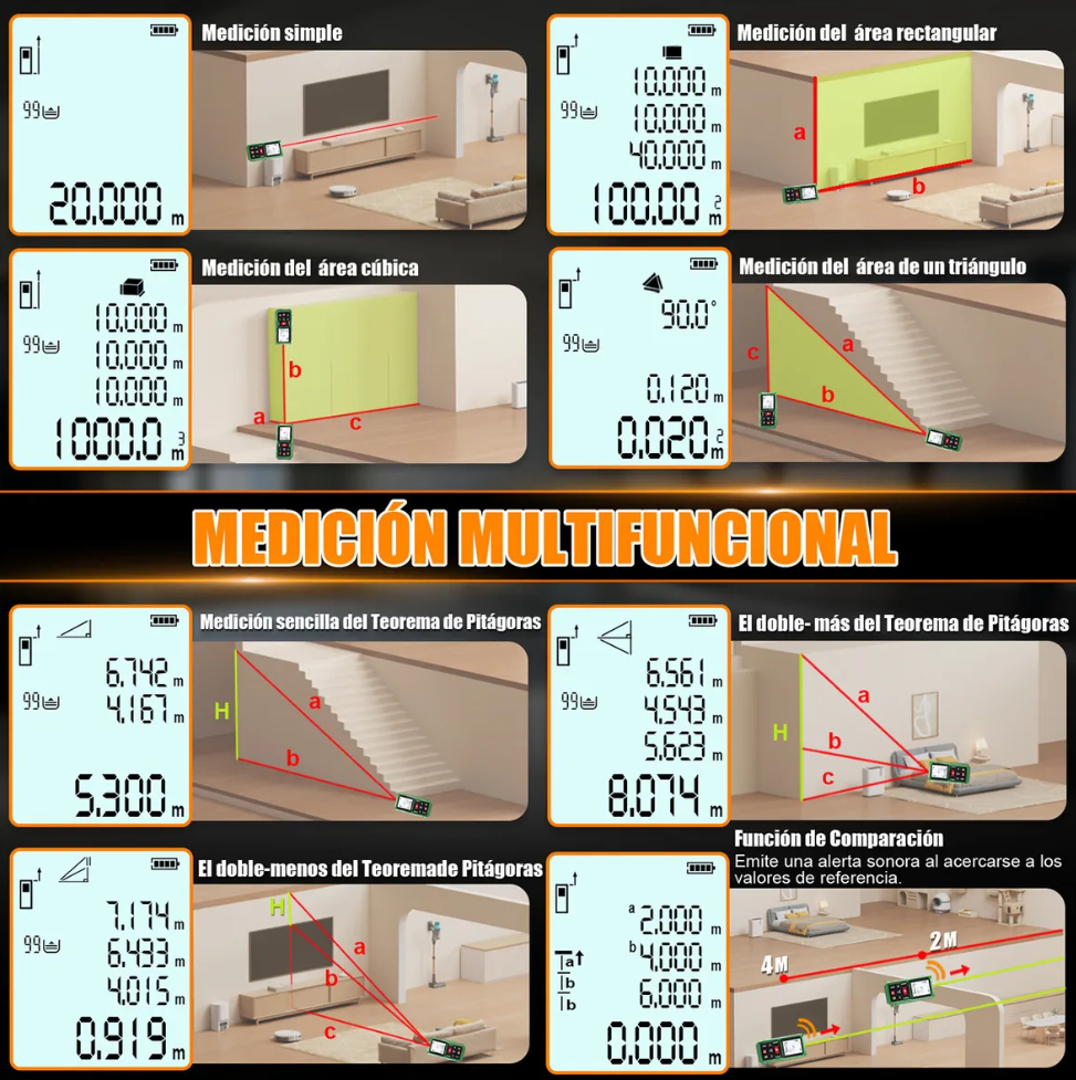 Cuenta con cuatro unidades de medición comunes: m, in, ft y la combinación de in y ft, lo que le permite obtener resultados rápidamente sin necesidad de realizar conversiones de unidades complicadas. Rendimiento de alta calidad: Este medidor de distancia no solo está equipado con una pantalla HD de 49 mm que se puede ver claramente incluso con retroiluminación, sino que además el dispositivo es resistente al agua, al polvo y a los golpes. Consume poca energía y, con un solo cambio de baterías, puede realizar hasta 4000 mediciones.