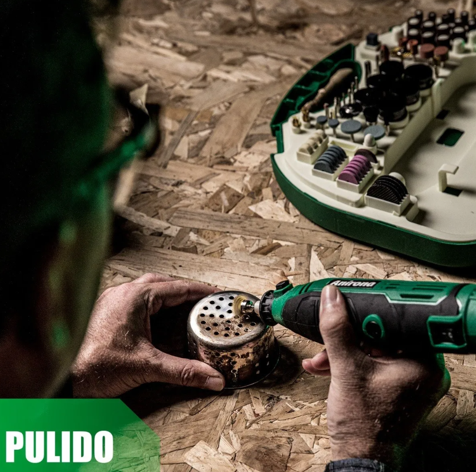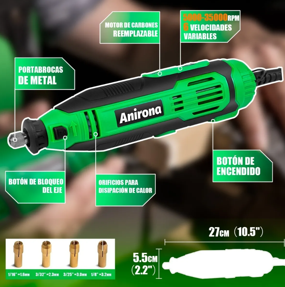1 x Herramienta rotativa Anirona 135W, 1 x Eje flexible, 211 x Accesorios, 1 x Caja de herramientas, 1 x Manual de usuario. Todos los accesorios son compatibles con diferentes marcas como Dremel, Black & Decker, Bosch, Truper, Anirona, etc. Lista de accesorios del producto: (X1) Mandril de cobre 1.6mm (X1) Mandril de cobre 2.3mm (X1) Mandril de cobre 3.0mm (X1) Mandril de cobre 3.2mm (X4) Rueda de lana pequeña (X6) Muela abrasiva rosa (X1) Gran rueda de lana (X6) Muela abrasiva verde (X1) Disco abrasivo de caucho (X1) Rueda de lana de bala (X5) Disco de corte de malla (X1) Piedra de afilar (X10) Gran círculo de arena (X10) Círculo de arena pequeño (X1) Gancho de eje flexible (X1) Llave pequeña (X2) Varilla de extensión (X2) Autoataque (X1) Cabezal de pulido de superficie pequeña verde (X2) Broca 1.6mm (X2) Broca 2.3mm (X1) Broca 3.0mm (X1) Broca 3.2mm (X7) Aguja de pulir (X1) Rueda de goma pequeña (X1) Rueda de goma grande (X2) Cabeza de pulido de bala naranja (X1) Cabezal de pulido de superficie pequeña verde (X1) Cepillo plano de acero (X3) Papel de lija en botella (X1) Cepillo Nipin (X2) Cabezal rectificador cilíndrico pequeño naranja (X2) Cabezal de pulido verde de gran superficie (X1) Cepillo para cuenco de acero (X1) Cepillo para bolígrafo (X1) Disco de corte estándar embotellado (X2) Pasta de corte embotellada (X1) Cepillo de cuenco de Ni (X1) Cepillo de Ni (X2) Cabezal rectificador cilíndrico grande naranja (X1) Amoladora eléctrica (X1) Sorteo suave (X1) Manual (X1) Caja transparente