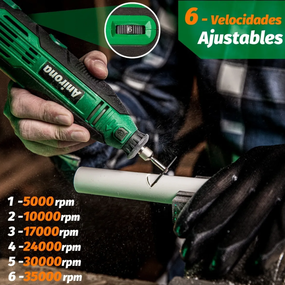 Modelo: AA-RTK-211 La herramienta rotativa ANIRONA tiene 135W de potencia. -FUNCIONES DE VERSATILIDAD: Ejecuta diversas funciones como cortar, fresar, lijar, pulir, perforar y muchas otras. -6 ROTACIONES CON VELOCIDAD REGULABLE: La perilla de ajuste de velocidad variable muestra 6 velocidades de 5,000 a 35,000 RPM. Al ajustar la velocidad, se pueden realizar grabados delicados en madera, vidrio, metales, plásticos, baldosas y otros materiales con control fácilmente. -VARIEDAD DE ACCESORIOS Y ESTUCHE: Incluye 211 accesorios de alto rendimiento que se adaptan a diferentes necesidades y ofrecen más posibilidades de trabajo. Viene con un estuche de transporte que mantiene los accesorios seguros, limpios, organizados y fáciles de encontrar. -