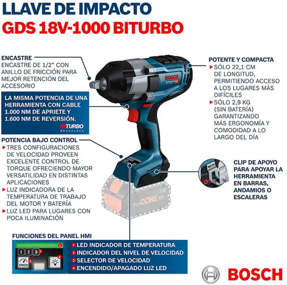 Combo Llave de Impacto Brushless Bosch GDS 18V-1000 + Bateria PROCORE