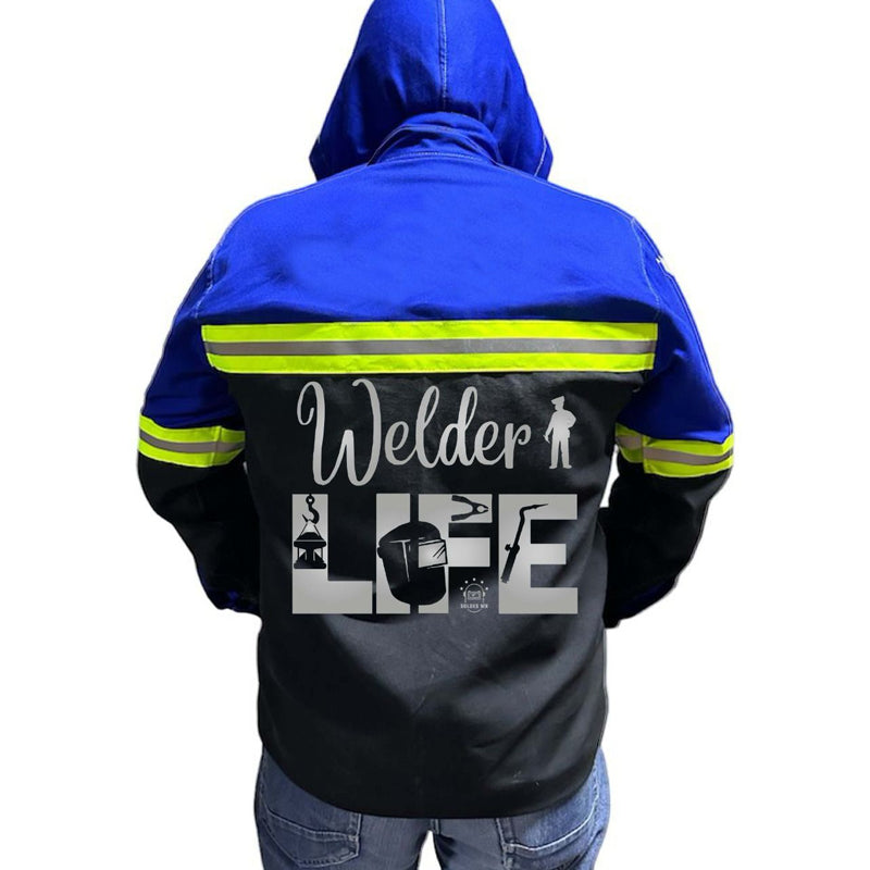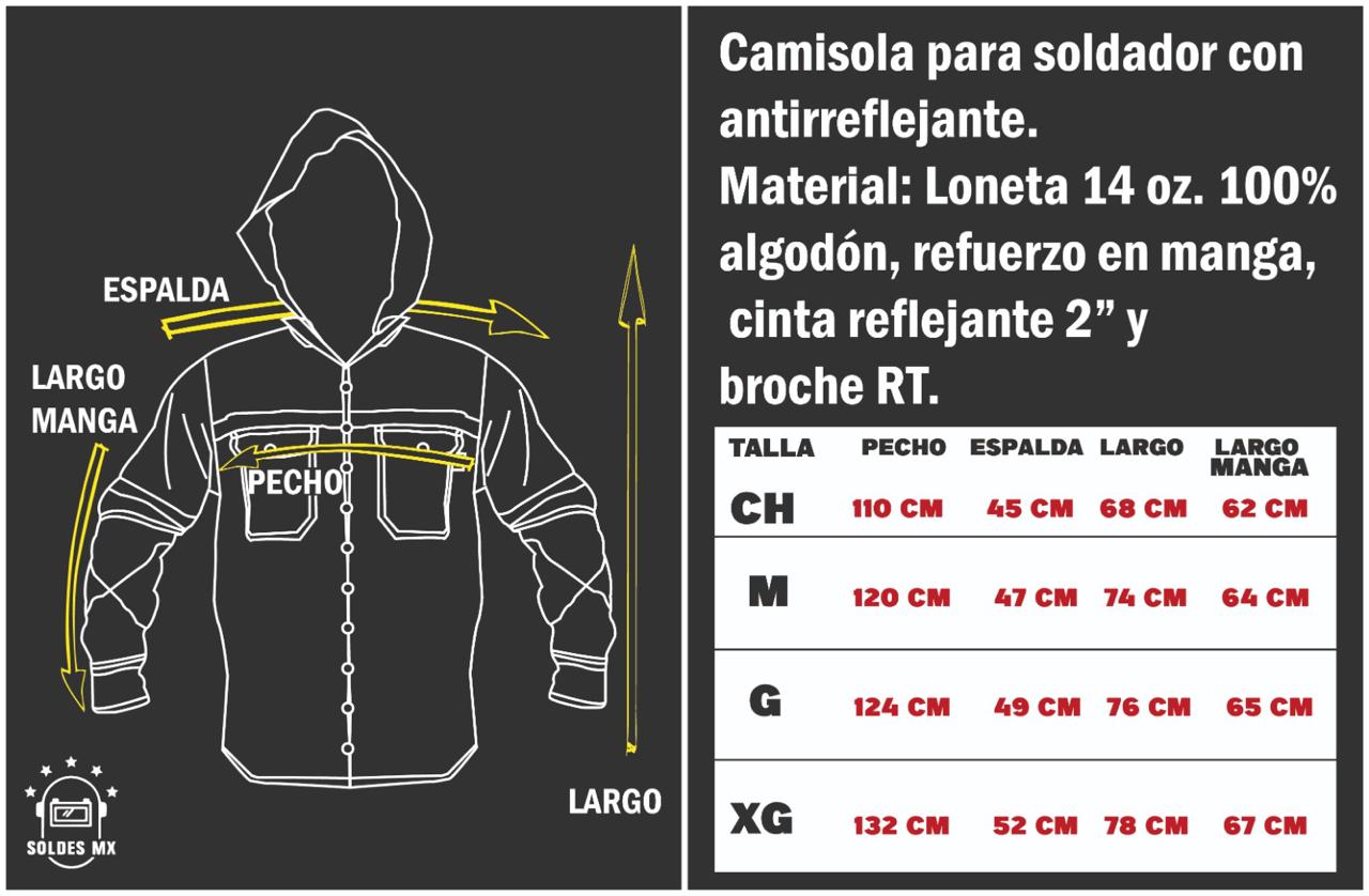 Camisa bicolor de loneta con gabardina. Refuerzo en mangas. Cinta reflejante de 2 pulgadas. Bolsa interna para celular Broche rt Gorro Triple costuras Hombro Mangas y Costados.