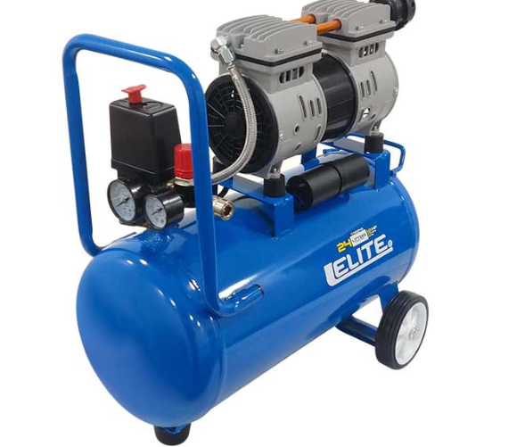 Compresor de aire silencioso Elite para uso profesional. Posee una potencia de 1.0 Hp y una capacidad de tanque de 24 litros.