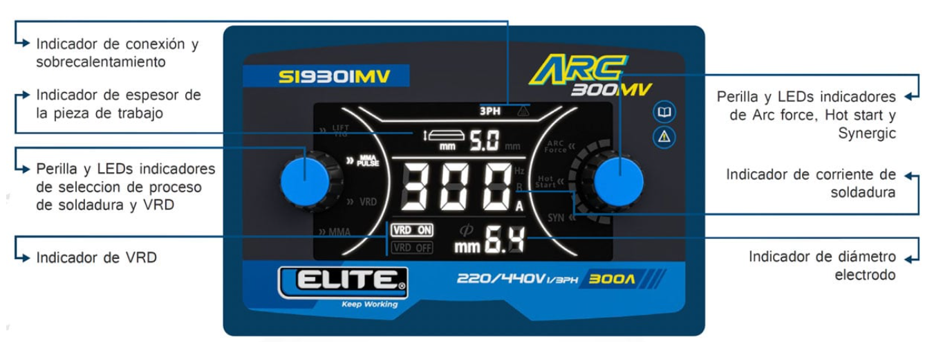 - Panel: Indicadores múltiples LED para corriente, diámetro electrodo, espesor pieza, VRD, conexión y sobrecalentamiento.