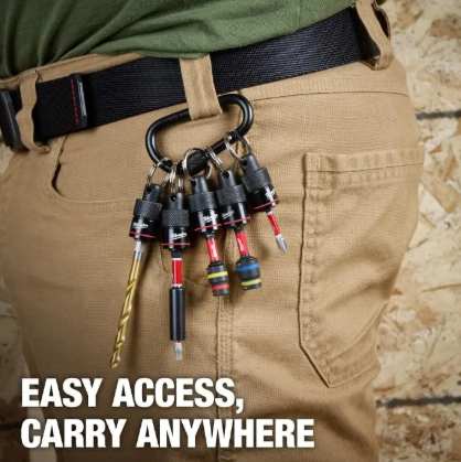 Nuestro portabrocas de 5 piezas con mosquetón ofrece un fácil acceso a brocas hexagonales de ¼", como brocas de destornillador, aprietatuercas, brocas, brocas escalonadas, etc. El diseño hexagonal interno y la retención de doble bola proporcionan una sujeción segura sin preocuparse por perder brocas. Fabricados en acero forjado, los portabrocas ofrecen un diseño duradero. El portabrocas de 5 piezas se combina con un mosquetón para un acceso rápido a las brocas más utilizadas y se puede enganchar a cinturones de trabajo, bolsos o bolsas.