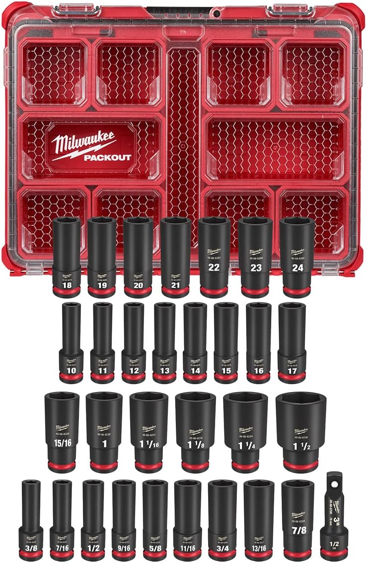 - 31 dados profundos SAE y métricos y 1 accesorio de dado de impacto. Tamaños: ",3/8", 7/16" 1/2, 9/16, 5/8, 11/16, 3/4, 13/16, 7/8, 15/16, 1 ", 1-1/16", 1-1/8", 1-1/4", 1-1/2", 10 mm, 11 mm, 12 mm, 13 mm, 14 mm, 15 mm, 16 mm, 17 mm, 18 mm, 19 mm, 20 mm, 21 mm, 22 mm, 23 mm, 24 mm, extensión de 3"