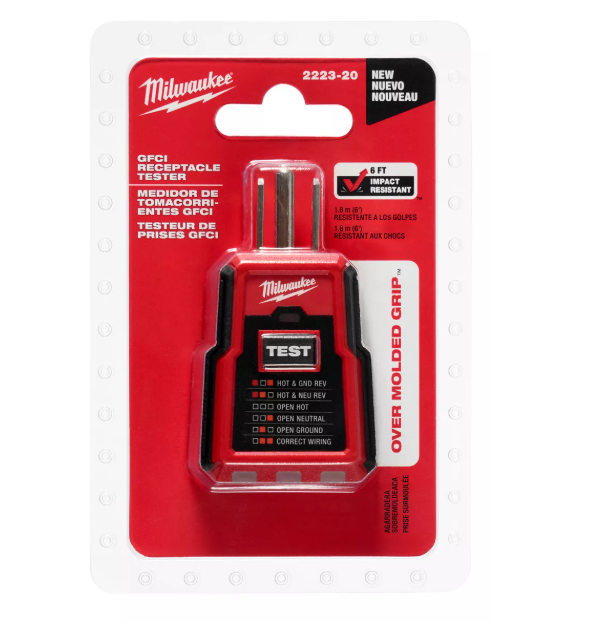 Nuestro probador de enchufes con GFCI está diseñado para reducir el riesgo de descarga eléctrica generado por los tomacorrientes. La empuñadura sobremoldeada proporciona durabilidad y comodidad para todas las aplicaciones. Además, la luz indicadora visual se enciende para indicar la activación de la prueba de GFCI, si funciona correctamente. Los indicadores visuales LED permiten determinar las condiciones del cableado de un tomacorriente eléctrico. Condiciones de cableado indicadas: Fase y tierra invertidos, fase y neutro invertidos, fase abierta, neutro abierto, tierra abierta y cableado correcto.