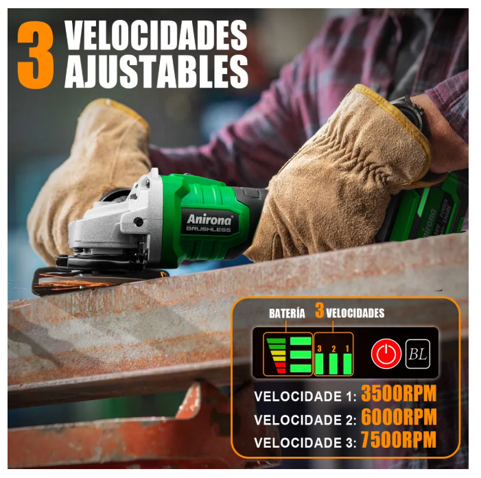 Velocidad ajustable en 3 niveles: Esta esmeriladora angular a batería de litio cuenta con tres velocidades, 3500RPM/6000RPM/7500RPM, lo que permite seleccionar diferentes niveles según el tipo de trabajo.