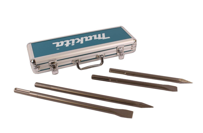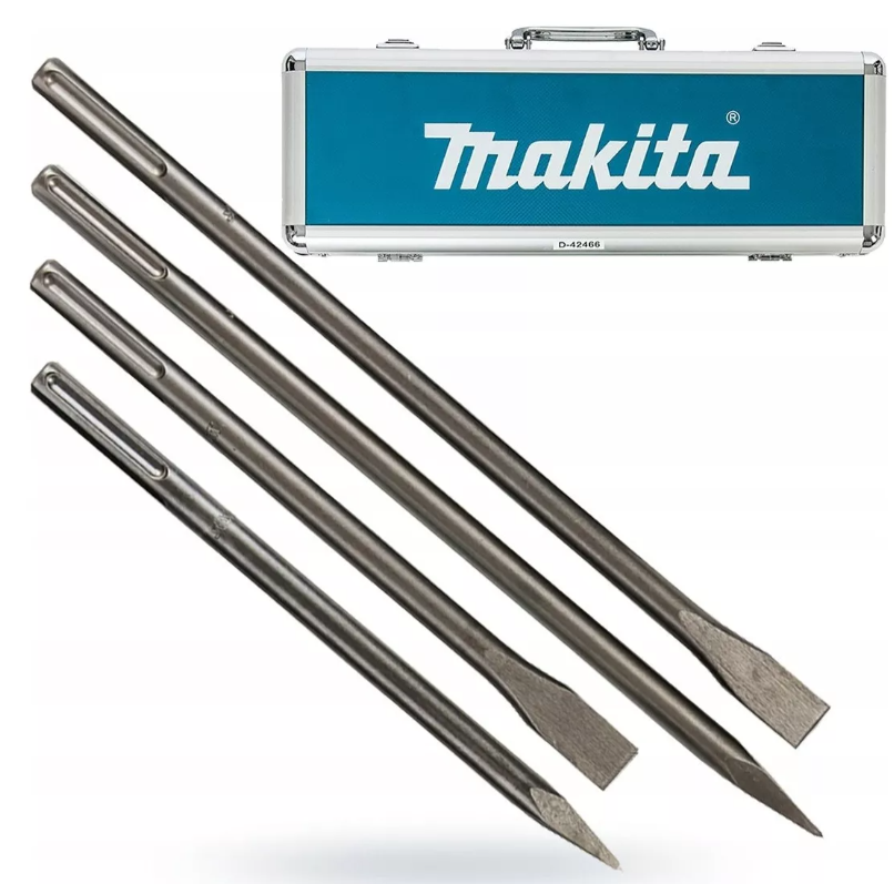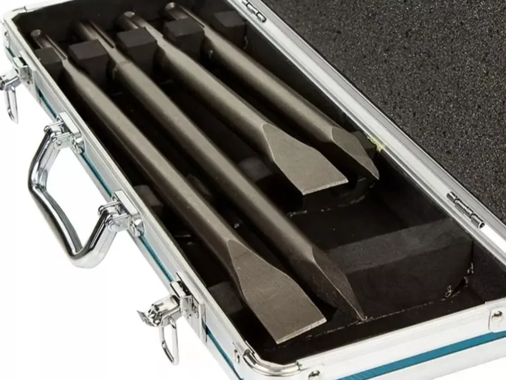 Juego de cinceles SDS-MAX para trabajar hormigón. La longitud total de estos cinceles es de 300 a 400 mm. El ancho de los cinceles planos es de 25 mm. El paquete contiene 2 punzones y 2 cinceles planos en una caja de aluminio.