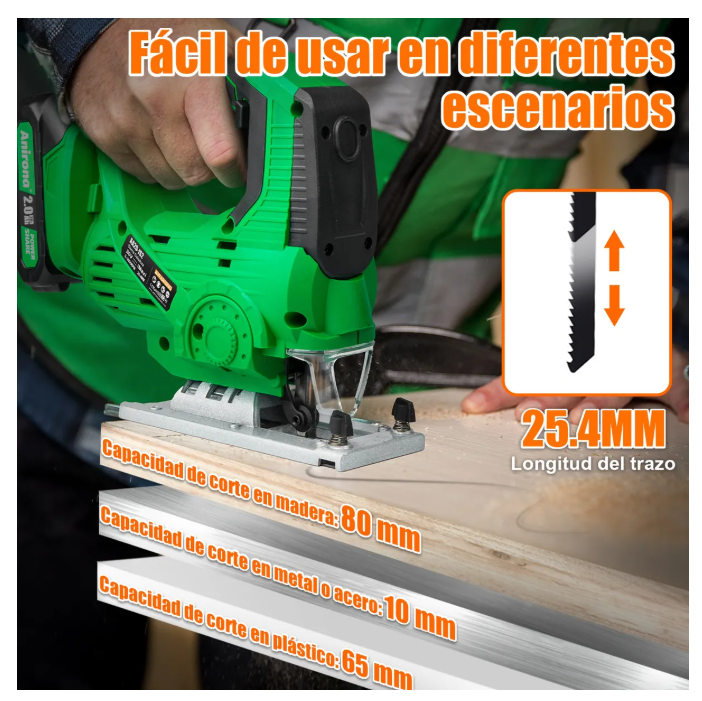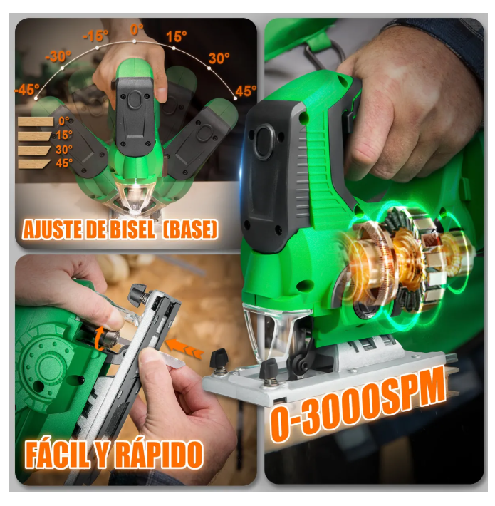 -Hasta 3000 SPM-: Velocidad máxima de hasta 3000 SPM, permite cortar tanto madera como metal de manera eficiente, ahorrando tiempo y esfuerzo.