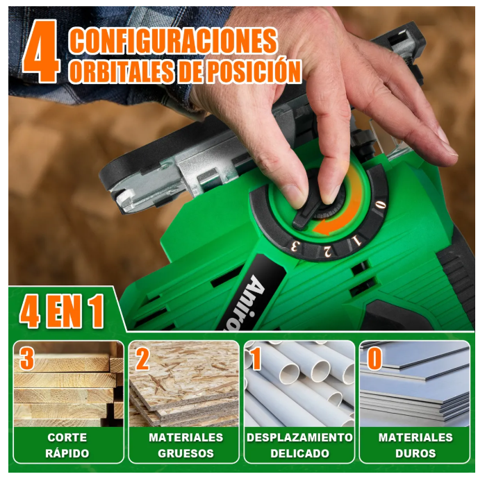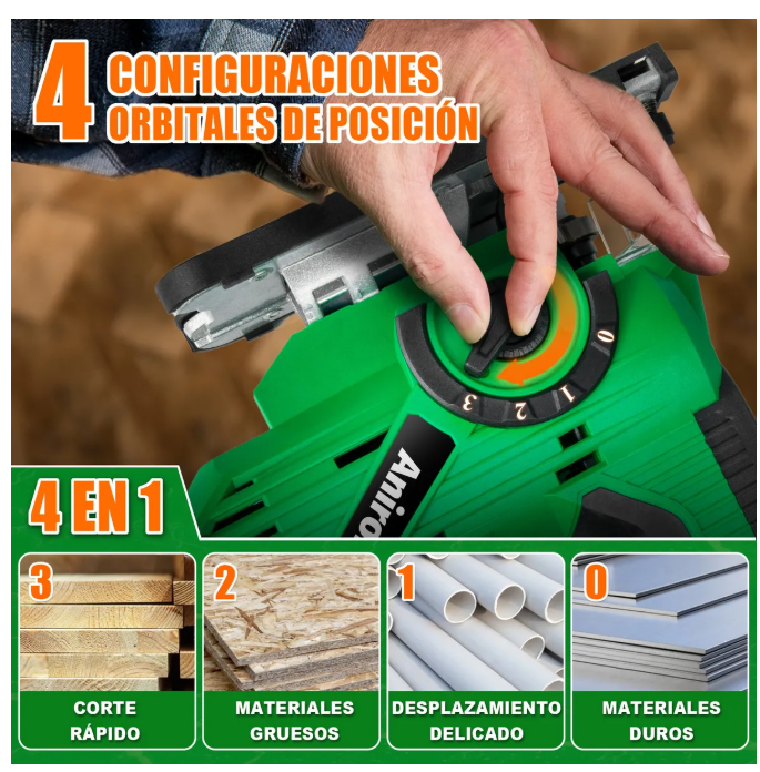 Anirona sierra caladora de acción pendular. Corte rápido de hasta 3000 carreras por minuto. Sistema de cambio rápido para seguetas tipo T.
