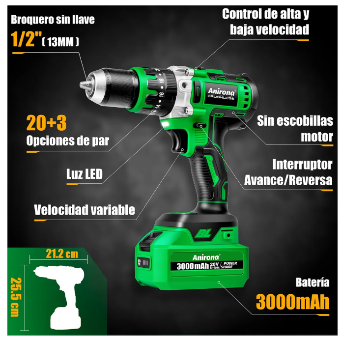 Taladro Anirona AA13NBL-31 Sin Carbón Rotomartillo 20V 2 Baterías 3000mAh