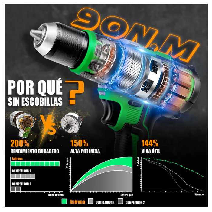Motor sin escobillas: Mayor eficiencia y durabilidad sin pérdida de energía ni chispas. El motor de alto rendimiento ofrece un torque máximo de 90 Nm.