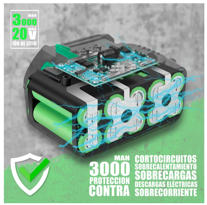 2 Baterías 3000mAh: Dos baterías de 20V 3000mAh con cargador rápido, para un trabajo continuo sin interrupciones.